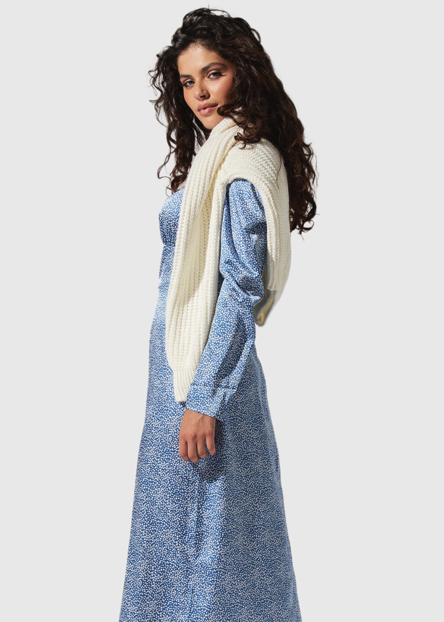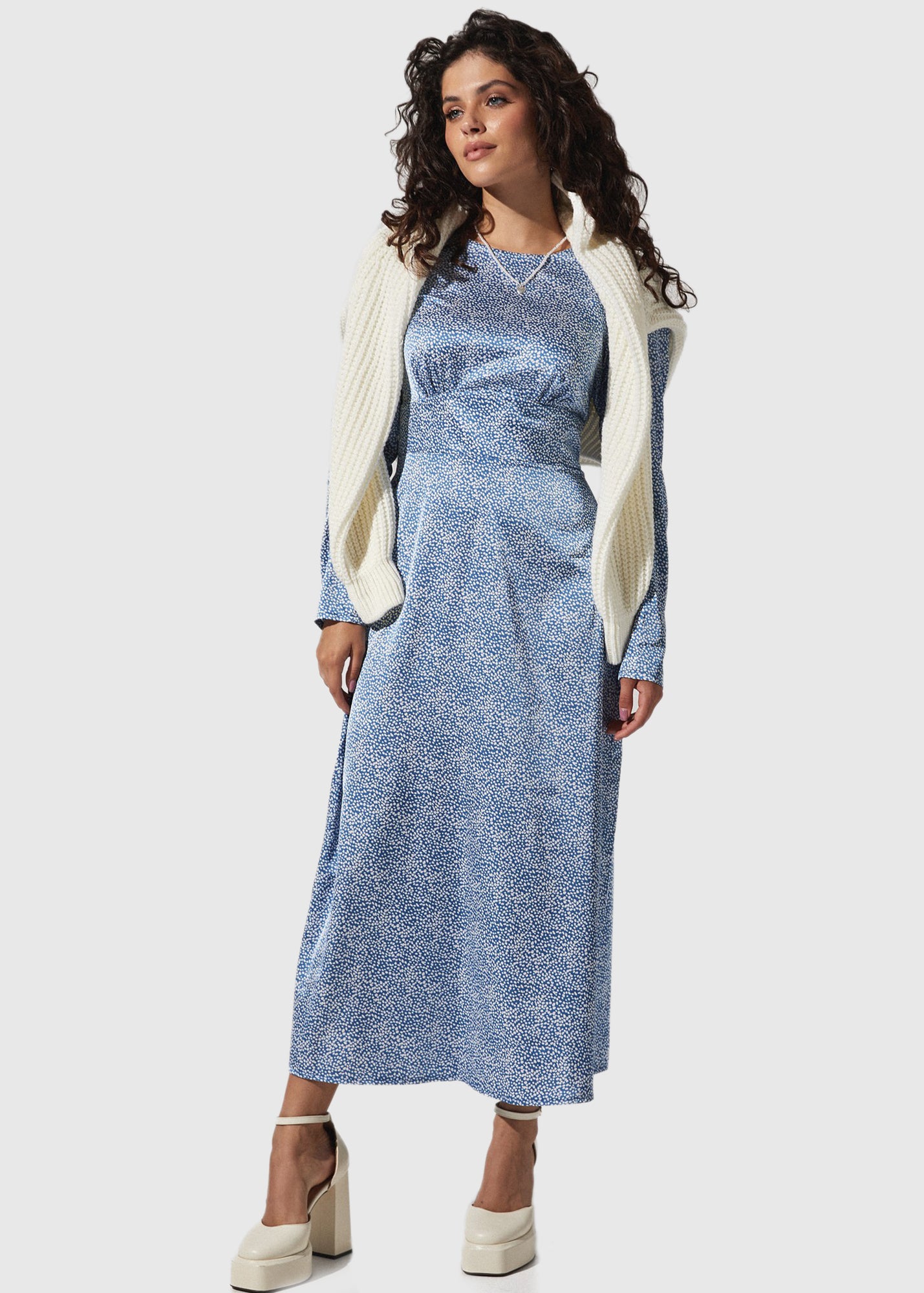 Голубое длинное вечернее платье с принтом