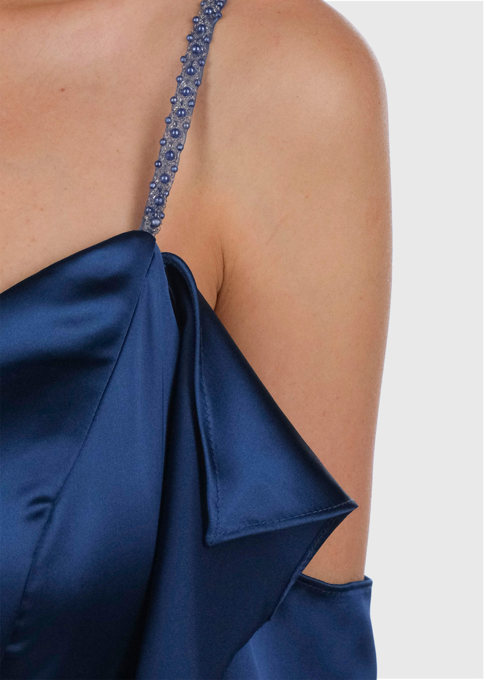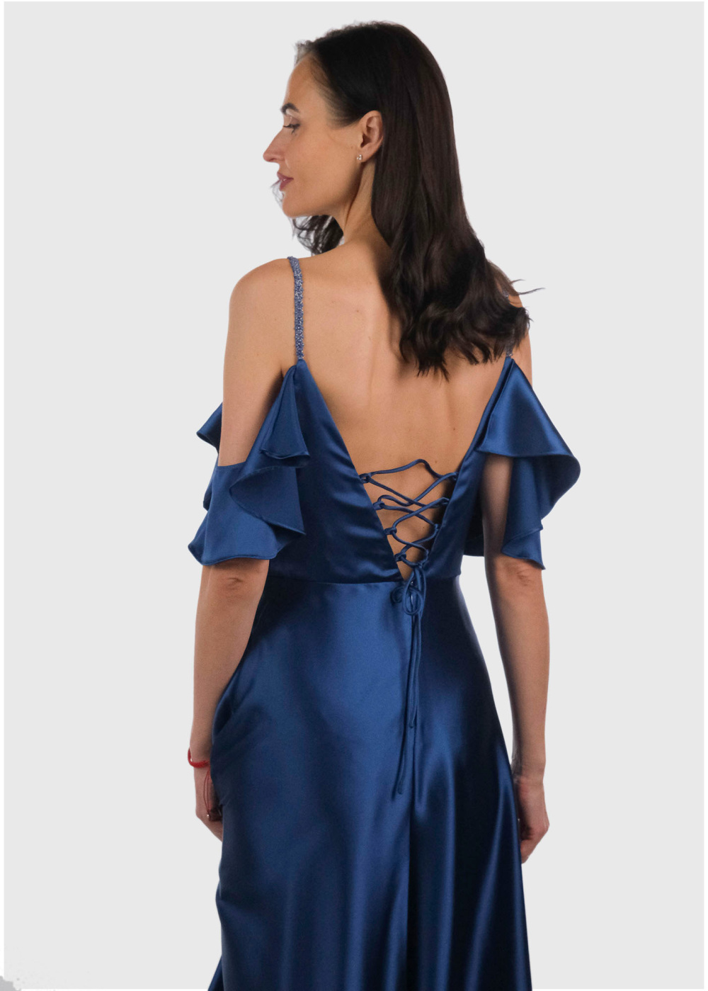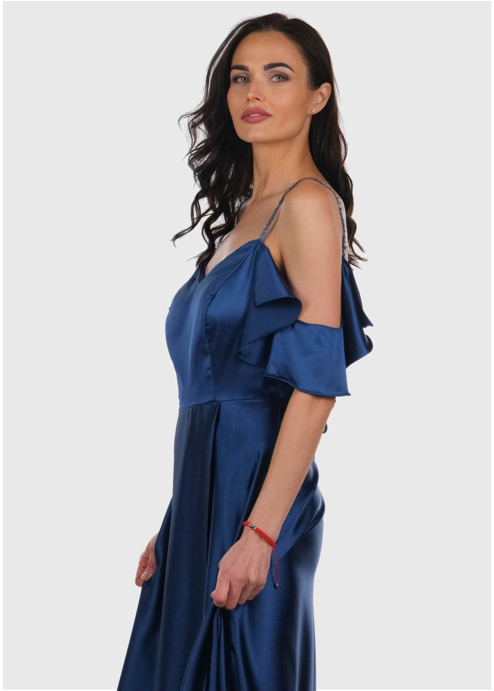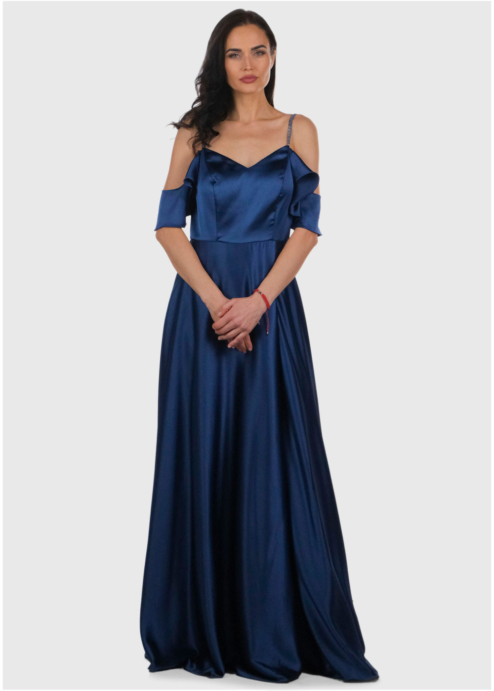 Aamina tumši zila gara vakarkleita ar atvērtiem pleciem