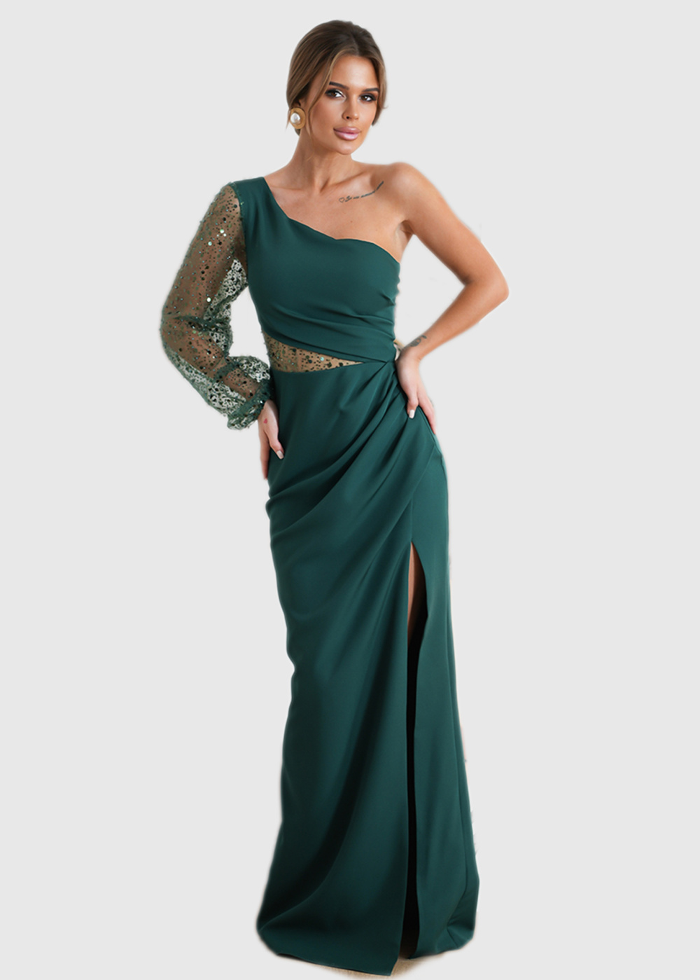 Akela zaļa gara vakarkleita uz viena pleca