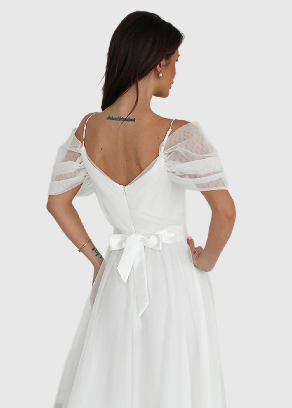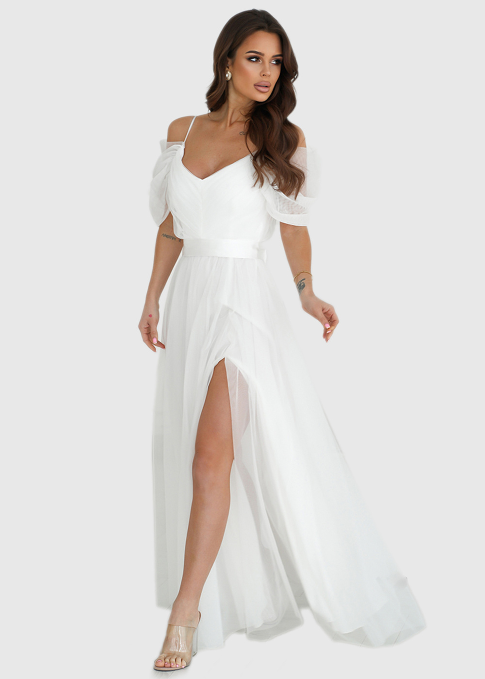 Cesaria balta gara vakarkleita ar atvērtiem pleciem