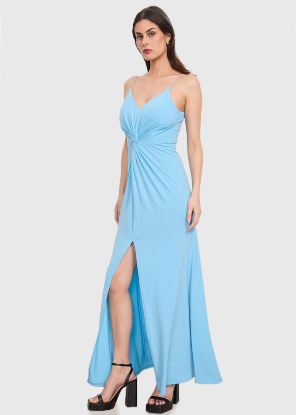 Gultena gaiši zila vakarkleita ar šķēlumu