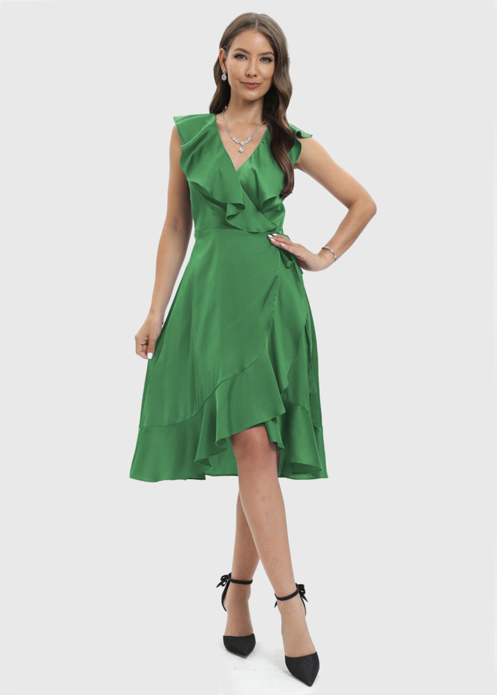 Inna zaļa vakarkleita ar volānu