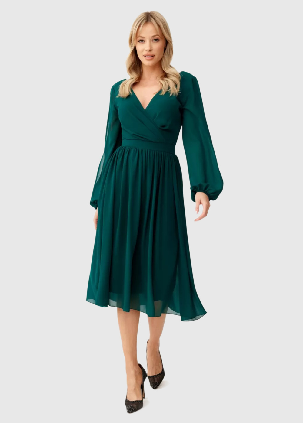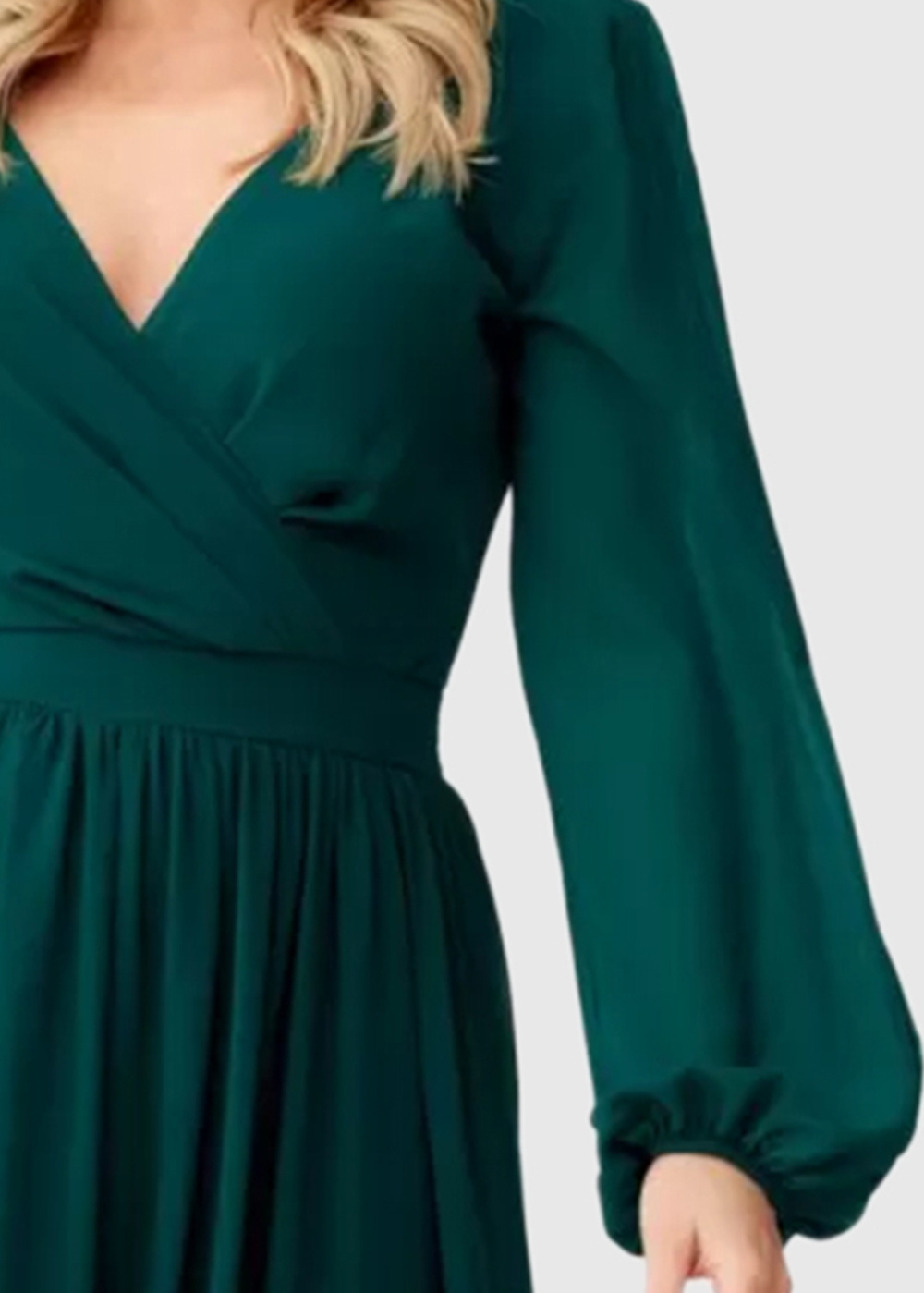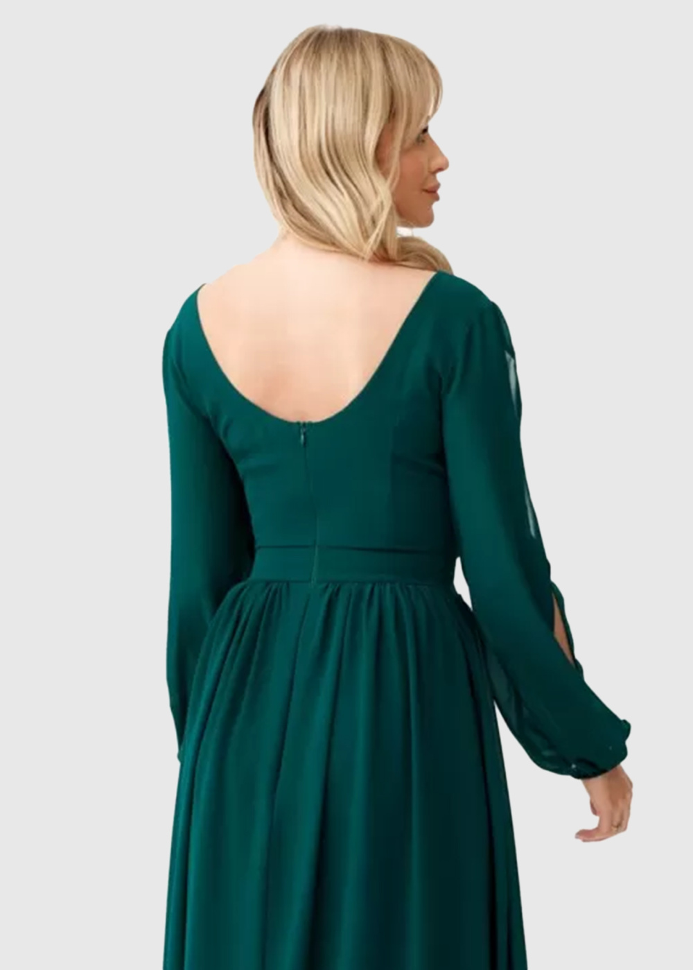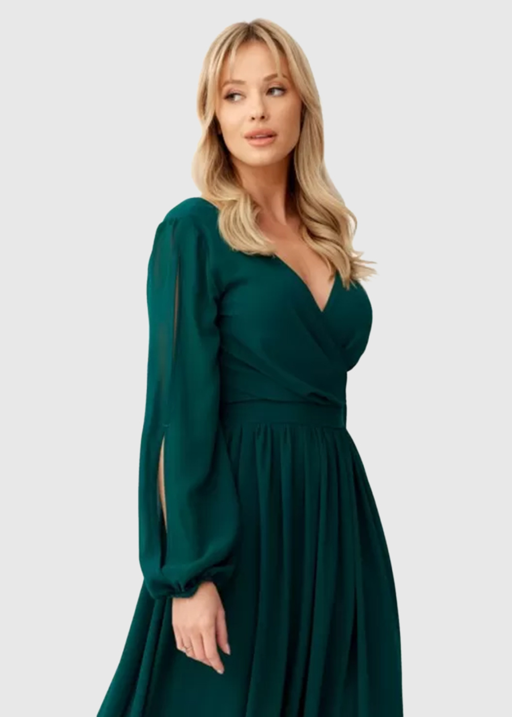 Kelly zaļa vakarkleita ar garām piedurknēm