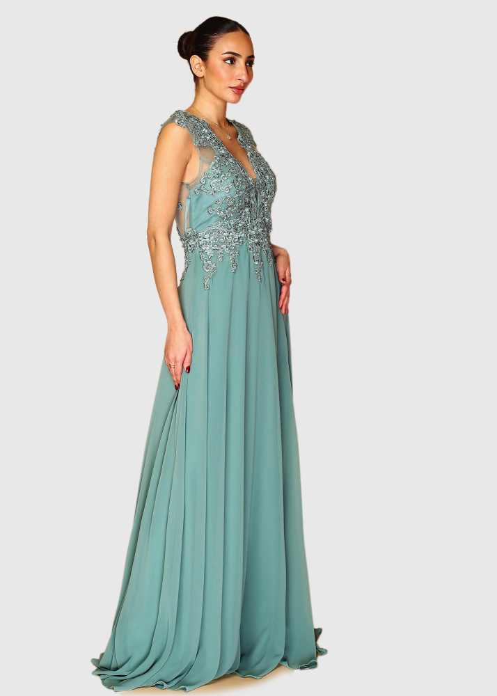 Veronica gaiši zaļa vakarkleita ar šķēlumu