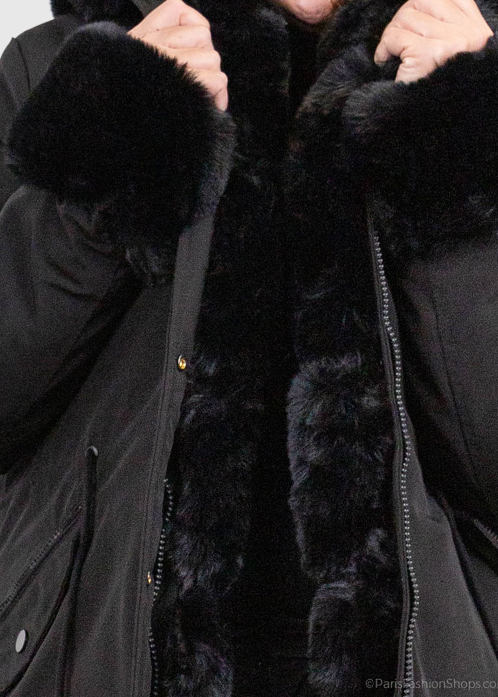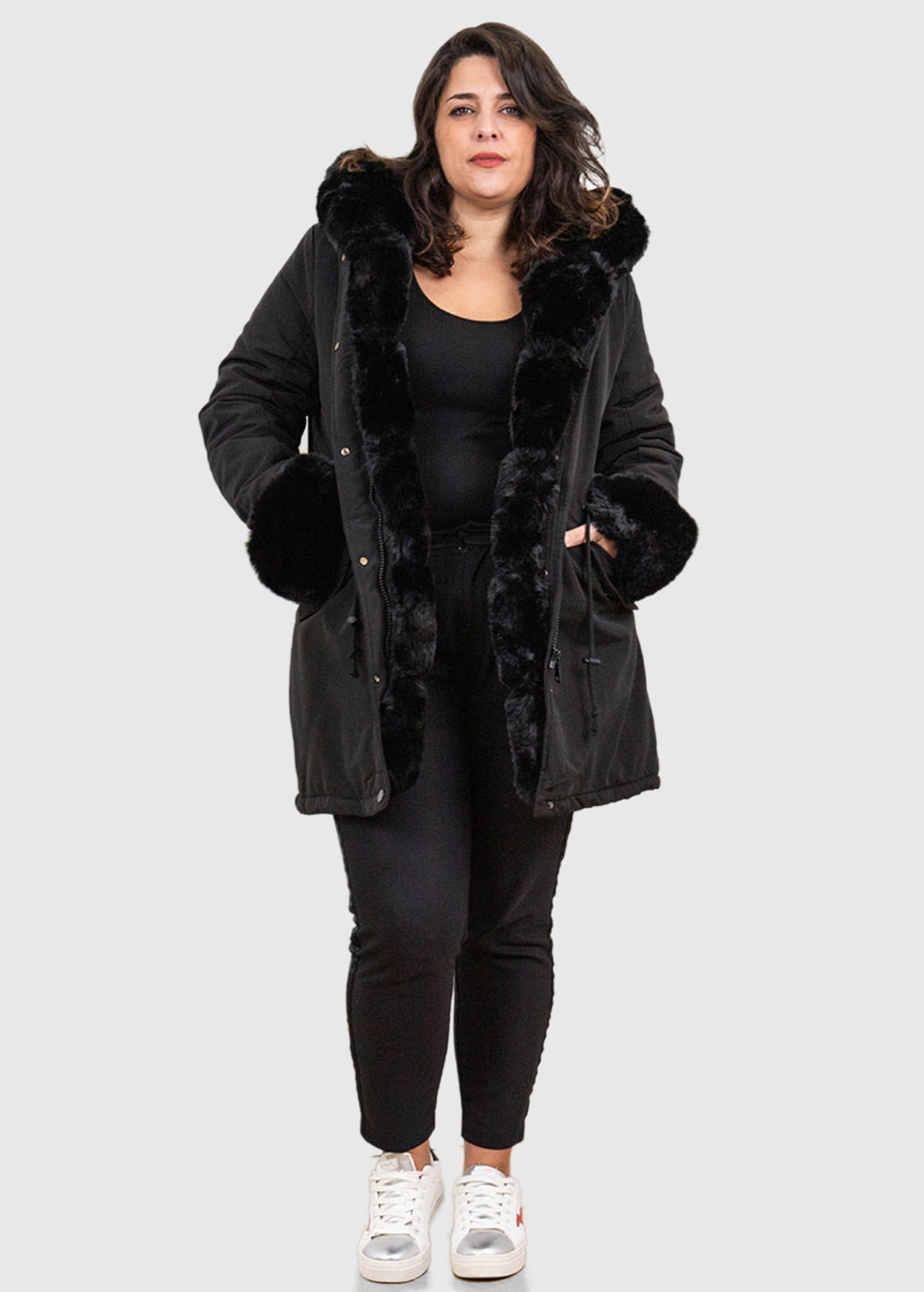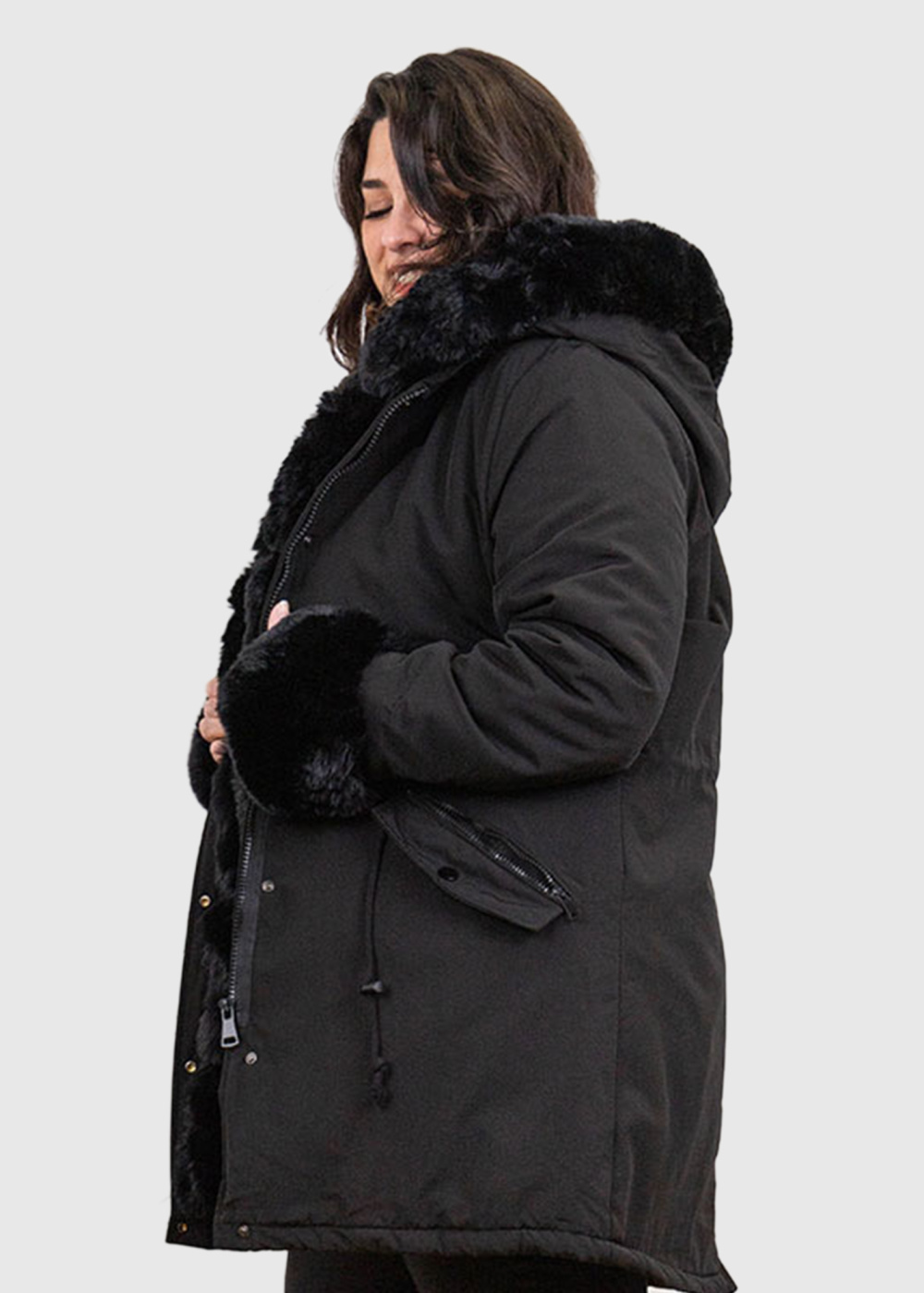 Ilaya Lielo izmēru melna jaka ar kažokādas iešuvumiem