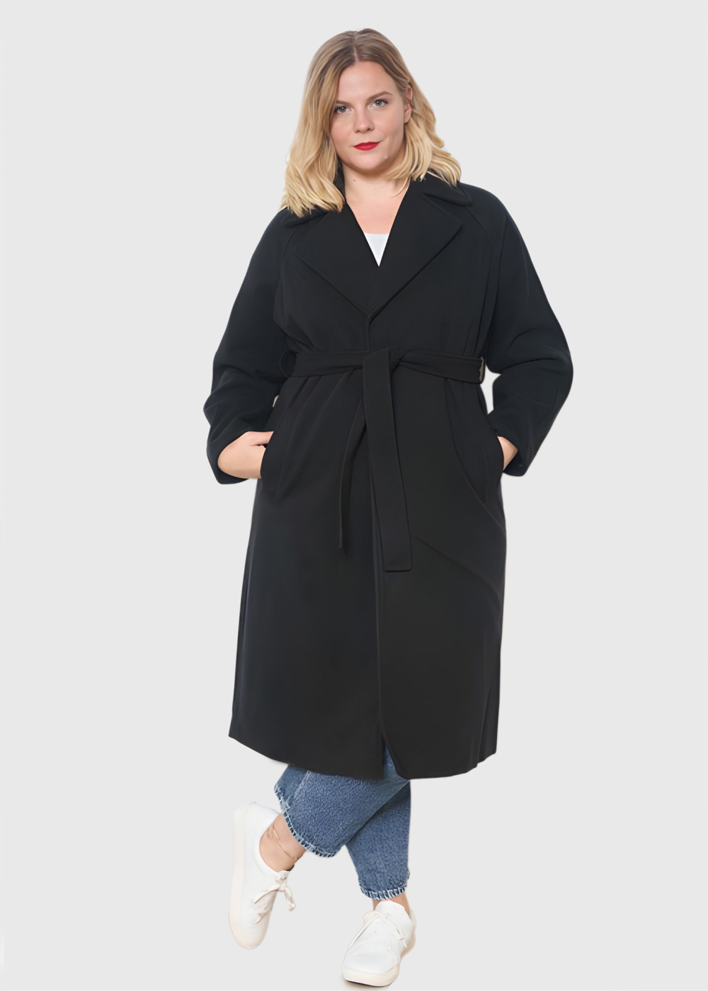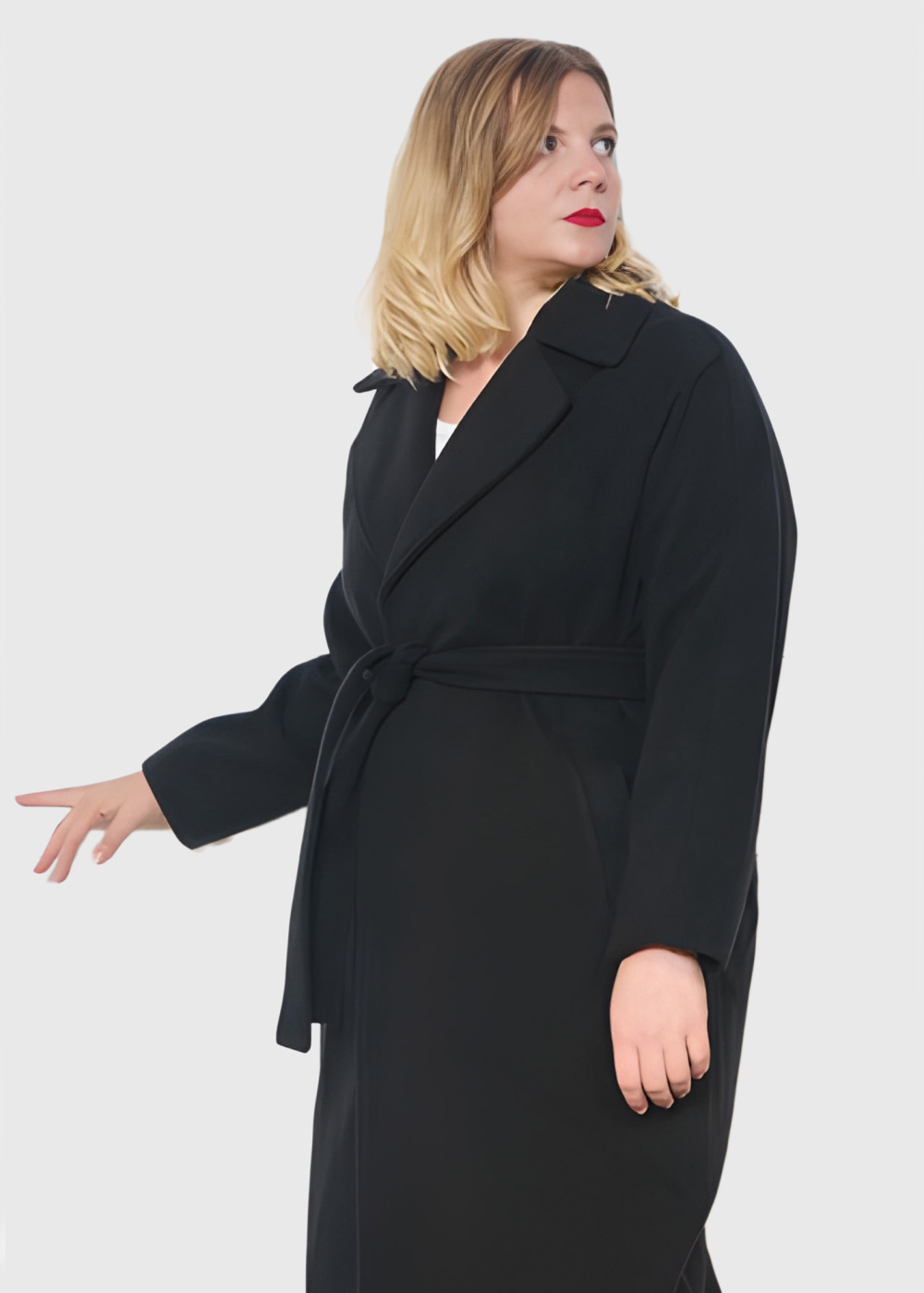 Jessica Lielo izmēru melns mētelis ar jostu