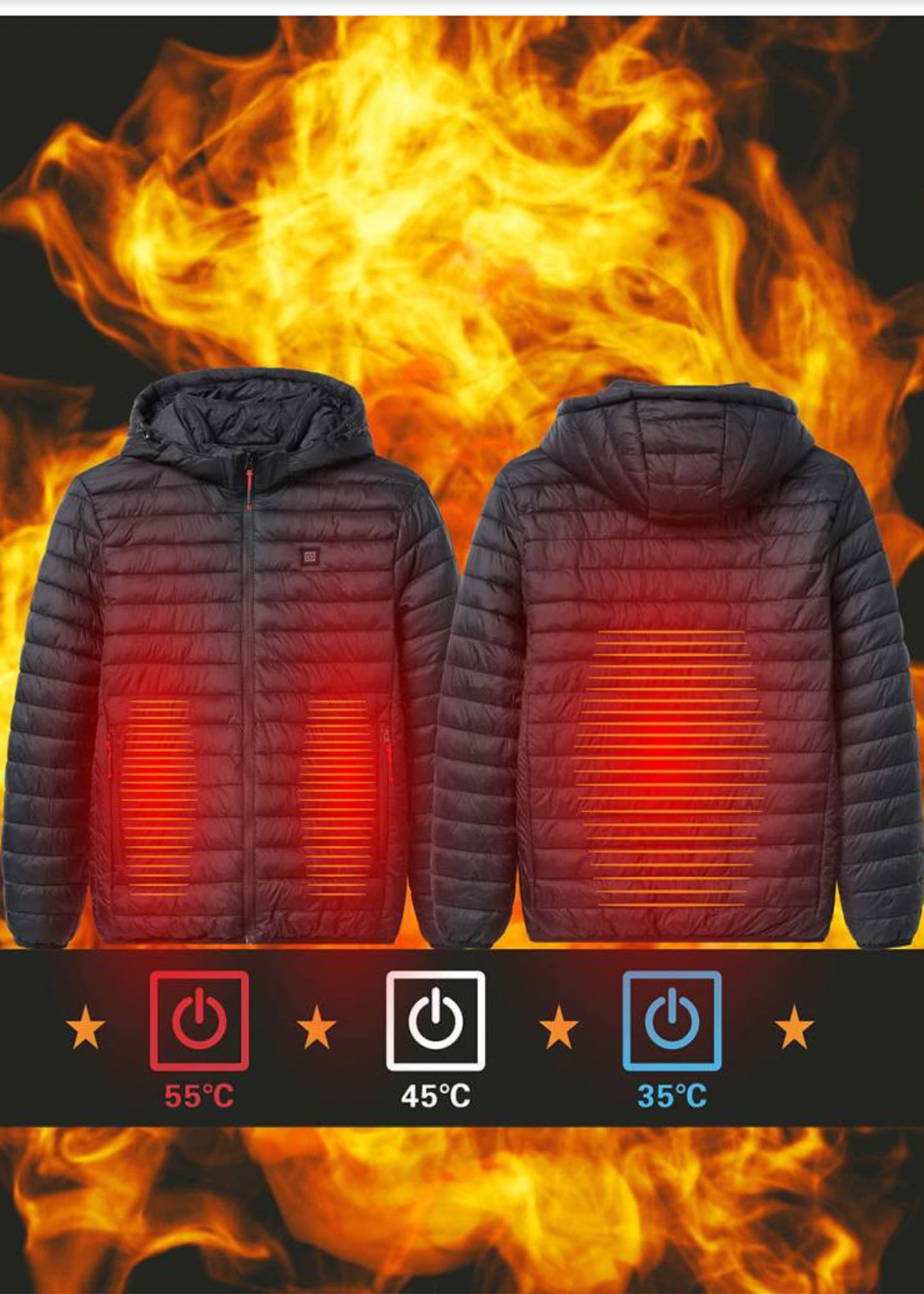 3) 3 sekundes paturiet ieslēgšanas slēdzi uz jakas,lai varēru izvēlēties jakas uzsildīšanas režīmu- zema temperatura zilā gaisma, vidēja temperatūra baltā un sarkanā gaisma maksimāla temperatūra;